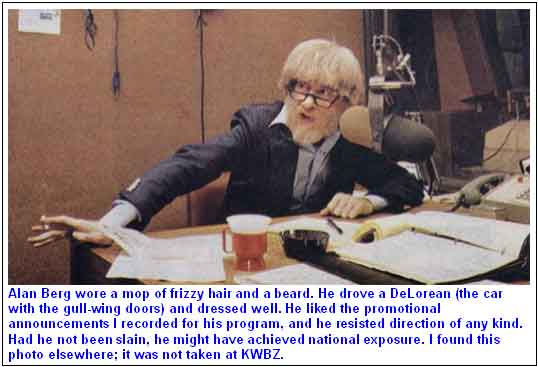 Mullins also negotiated with Alan Berg to return as a talk host on the 1150 AM dial position. Berg had debuted in talk radio in 1974 prior to the Cartwright/Mullins purchase when the station was KGMC. An attorney, Berg had worked as a prosecutor in Illinois before leaving law practice and moving to Colorado for work in a tailoring shop—and Berg indeed did spend most of his money on clothes—and cars.