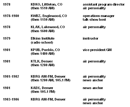 Half of the time during this period, I worked part-time, mostly in the earlier years while attending high school and college, and then again in the later years while working full time for a consulting engineering company and a publishing company. Sometimes I worked for more than one station at a time, such as a period when I worked for KIMN and KUAD; KWBZ and KLAK; and KPPL and KDKO. That was somewhat unusual in the business, but somehow it worked out.