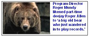Mundy hired other part-timers to work some of the other shifts, including Justin D. Fogg (think about it) and Roger Allen, whom he likened to "a big old bear who just wandered in to play records."