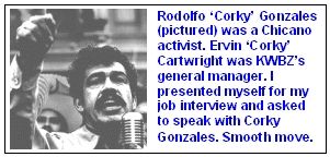 Here's a story of getting off on the wrong foot: Failing to reach Boyles, I made an appointment to see the general manager. At the scheduled time, I arrived and told the receptionist, Sjana, that I was there to see Corky Gonzales. Remember, the general manager's name was Cartwright. A man named Rodolfo "Corky" Gonzales was a Chicano activist who had been in and out of trouble with the law.