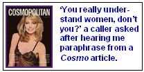 On one occasion, I was paraphrasing a Cosmo article to start the show when a caller came on the air to say, "When you first started on the station, I thought you were really stupid. But I've been listening to you for the past 15 minutes, and you really understand women, don't you?" I wish, my friend; I wish.