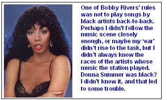 Rivers had a rule: Never play songs by black artists back-to-back. When Rivers was critiquing a recording of my program, he heard me follow a song by a black group with Donna Summer's "Love to Love You, Baby. He was angry that I had violated the rule. But I told him I didn't know Donna Summer was black. "If it sounds black, don't play it back-to-back," he replied. I said that Summer didn't sound black to me, and could the tape cartridges perhaps be labeled to indicate the artists' race? That never happened.