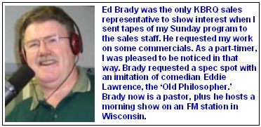 One of the sales reps, Ed Brady, was intrigued by my promotional efforts. Brady also had a background as an air personality. He recognized the creative effort being expended, and occasionally he would ask for me specifically to produce commercials for his clients. To draw such a request as a part-timer really pleased me.
