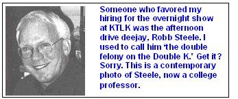 The afternoon drive deejay, Robb Steele, said that he favored hiring me for the overnight show. His theory was that listeners using clock radios would be more likely to leave their radios dialed to KTLK for the morning wakeup if they liked what they heard at night when they set the alarm. I don't know whether there had been any research to indicate the truth in that, but I was pleased to have his support.