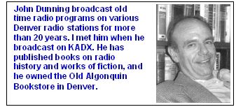 My weekend work at the co-located KADX-KBRQ studio facilities allowed me to visit with John Dunning, who hosted a segment of old time radio programs Sundays on KADX. Dunning's program bounced from station to station over a period of a couple of decades. Perhaps the only time Dunning's program benefited from the audio clarity of FM was when he broadcast on KADX.