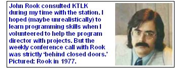 In 1974, John Edwards was working KTLK's 10 p.m. to 2 a.m. shift. He and I had worked together at the college station in Fort Collins. He suggested that I apply for a part-time position with KTLK because he and some other staffers were dissatisfied with the part-timer then working there.