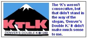 The station had a slogan that I always found to be out of alignment with, well, the call letters. What I mean is that the call letters, KTLK, had two "K"s in it, but they weren't consecutive. That didn't stand in the way of the slogan, "Denver's Double K." By way of emphasis, the "K"s were printed in larger size. Maybe that's what made the difference.