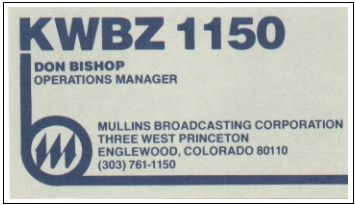KWBZ was nominally an Englewood, Colorado station, and a candidate for Englewood city council, Harry Fleenor, bought spots. Both Mullins and Fleenor were unaware of the FCC rule, so Mullins was charging Fleenor the higher rate for spots in drive time.