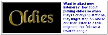Look out. On the air, with no time to train the talk show hosts, here came the oldies. And a bright, bright light shined on one of the difficulties in making changes at a talk station: complaints don’t just come in on the office phone, they go on the air. Most of the callers aired after the change said little about topics the hosts were promoting and a lot about how much they hated the music.