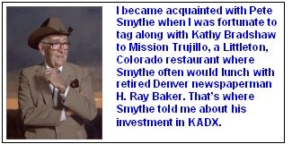 Ken Lange, a Denver radio station executive, and Pete Smythe bought KADX-RM in the 1970s when FM stations were't pricey and FM audiences were small. Smythe was installed as the morning show host. On KADX, he replicated the program he previously broadcast on KOA. Unfortunately, the signal could not reach Smythe's former, loyal, rural audience. Metro-area listeners either didn't know he was back on the air after an absence of several years, or mostly didn't care. Smythe soon left the morning show, becoming a silent partner as Lange changed KADX into a jazz station. "My Irish investment," he called it. The reference meant that Lange would call him each month to tell him how big a check he had to write as his part of making up the station's cash operating shortfall.