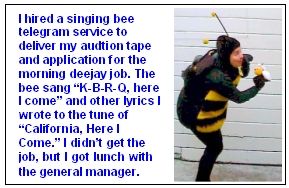 I wrote lyrics to the song, "California, Here I Come" that said "K-B-R-Q, Here I Come" and hired a singing telegram service to send someone to the station to sing it to Mundy. The "singing bee" also delivered a large box with a tiny cassette audition tape.