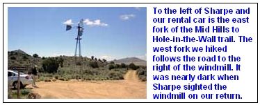 The sun set at 7 o'clock, three hours after we had turned around. I thought we still were some distance from the Mid Hills trailhead, but about 10 minutes later, Sharpe yelled that he saw the windmill. He reached the car first; I got there a few minutes later, just before it got dark enough for the stars to come out. |  |