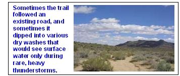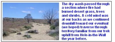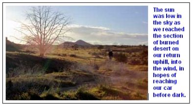 I think we would have to consider ourselves fortunate that the hike turned out as well as it did in the face of our poor navigation. Without a compass, we were figuring our direction by shadows cast by the sun. The trail map wasn't detailed enough for us. The hiking markers didn't clearly indicate which was the trail we wanted and which were side trails. Several people have suggested we buy a GPS unit for our next hike of a similar nature. Actually, we'd like to return to Mojave Natural Preserve and see if we can get this particular hike right. We still think it would be worthwhile.
