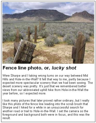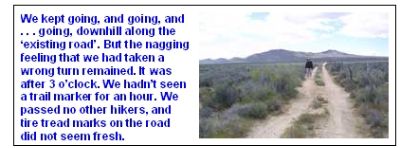 Time was getting away from us. It was after 3 o'clock, and I didn't see any hope of finding the ranger station in time to get a ride back to our car. In fact, I started to wonder whether we could get back to the car before dark. I didn't want to think about it, because it represented miles of backtracking, uphill and into the wind. Ugh! We kept going, passing through two barbed wire gates that spanned the road. Sharpe said, "It's just around that ridge" more than once, but we never saw any landmarks that seemed familiar from last year's hike, except possibly for Table Mountain, which the trail guide said "has served as a landmark for native Americans as well as travelers passing through the region." It didn't help us much.