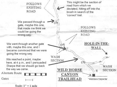 Here's the trail map, marked with where we might have been. Or we could have been somewhere else entirely. When it got to be 4 o'clock, I told Sharpe that as much as I hated backtracking, I thought our best chance of avoiding having to spend the night in the desert would be to reverse course and go back to the car. We didn't know where we were, but we did know how to go back the way we came. Someday, maybe I can show my photos to a ranger who can tell me whether we were on the right trail, after all. But as the sun dropped lower in the sky, I wanted to go for the car and not risk wandering further into the desert without finding Hole-in-the-Wall or the Wild Horse Canyon trailhead. Sharpe felt certain that we would intersect the Wild Horse Canyon Road if we just kept going, but he was willing to go back the way we came.